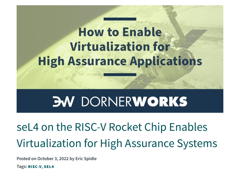 Risc-V is an up and coming architecture that allows chip designers to use an open and royalty free ISA to bring their boards to market. While I was an intern at DW my task across 2 rotations was to get a guest running under seL4 on a RISC-V softcore Rocketchip. The rocketchip ran on the PL of a ZYNQMP SoC. I completed this work but not without some help (Thank you Robert Vanvossen and Michael Doran). At the time this was considered to be the first RISC-V guest running on seL4 on real hardware (QEMU was done before this). I wrote an article about this which can be found below in the blogs section.