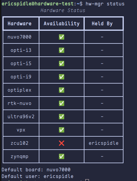 hw-mgr was a tool I developed for Dornerworks (DW) as an intern. During Covid-19 many people were forced to work remotely and this caused a challenge when sharing hardware. One of my first tasks when starting at DW was to create a remote system that allowed for users to check out, test on, and return hardware virtually. Utilizing DW's CI server at the time I wrote a python application that allowed users to share hardware while SSH'd into the server. Using Gitlab's API I was able to lockdown hardware that was currently in use for a CI/CD pipeline as well. This not only led to increased productivty but also protected more expensive hardware by keeping it in one spot. This task involved working with python, gitlab's API and bash to create a remote testing enviornment that engineers all across DW could use.