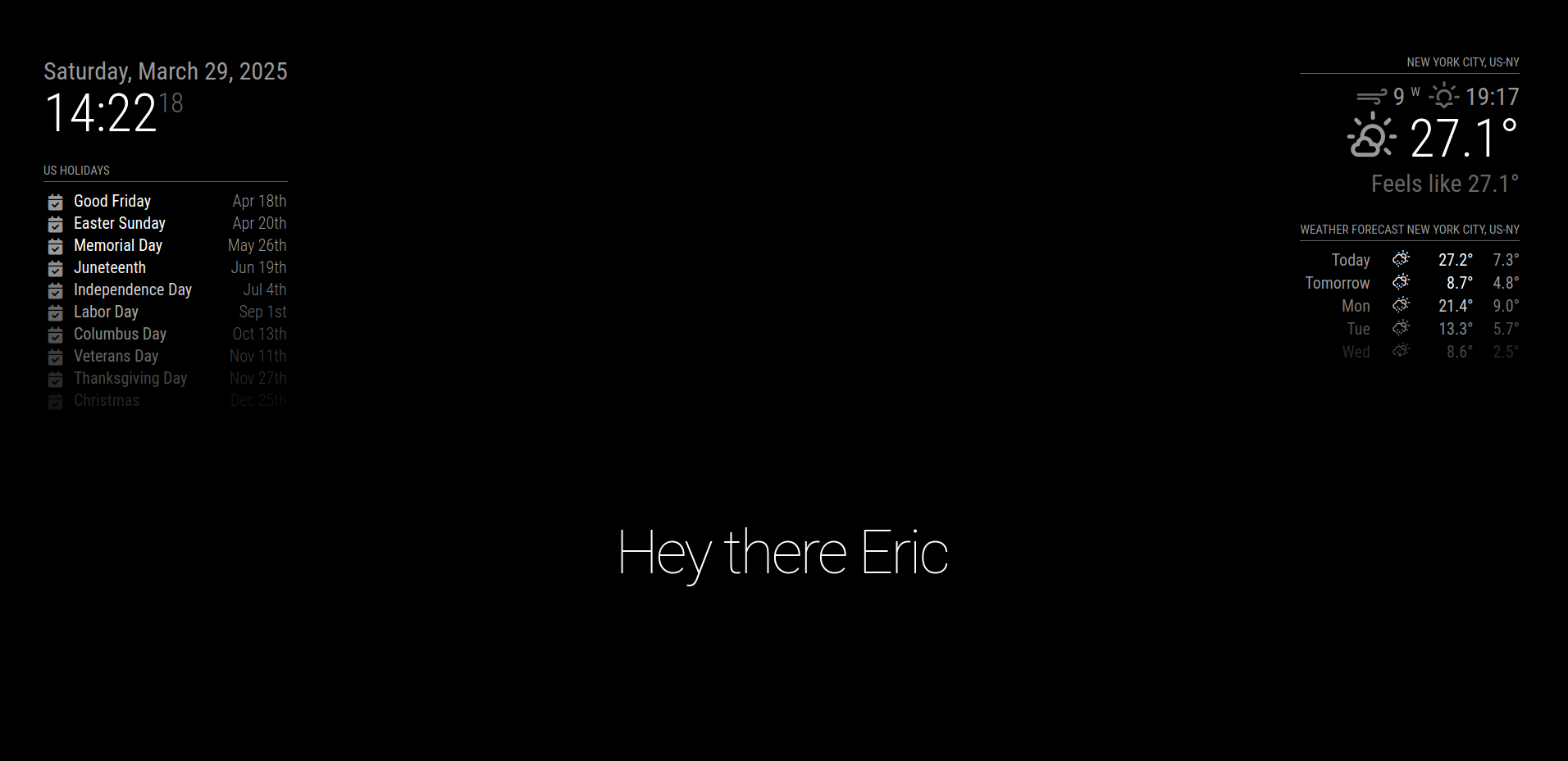 Setup a rapsberry pi and raspdebian for running the mirrorBuilt a frame and backing structure to display the laptop screen through 2-way glassCustomized some modules to include messages that were relevant to meSetup static IP/network configs and SSH to allow for easy debug and config accessStarted work on my own custom module to pull data from the web and display it to the mirror