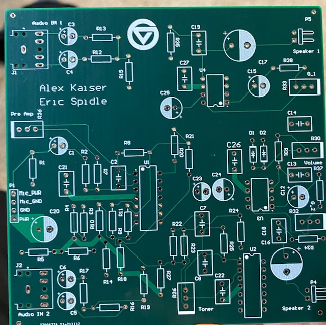 This project was for a circuit class I took in my undergrad where we were tasked with creating a speaker using a PCB board. The design allowed for output of two speakers, and a microphone that amplified a users voice. It also took in an aux cord in order to play sound so music from a phone could be played over the speaker. The speaker was also required to be adjustable in volume using potentiometers. This project was also selected to be 1/3 shown off at GVSU's project showcase (voted on by classmates). This project involved a great understanding of circuit design and the differnt types of circuits that go into turning sound waves to amplified speaker output.